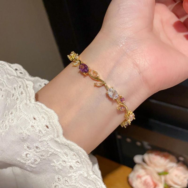 ·Elegant Design: Bracelet Featuring Delicate Floral Pattern with Oval-Cut Cubic Zirconia Stones in Pink and Purple Hues