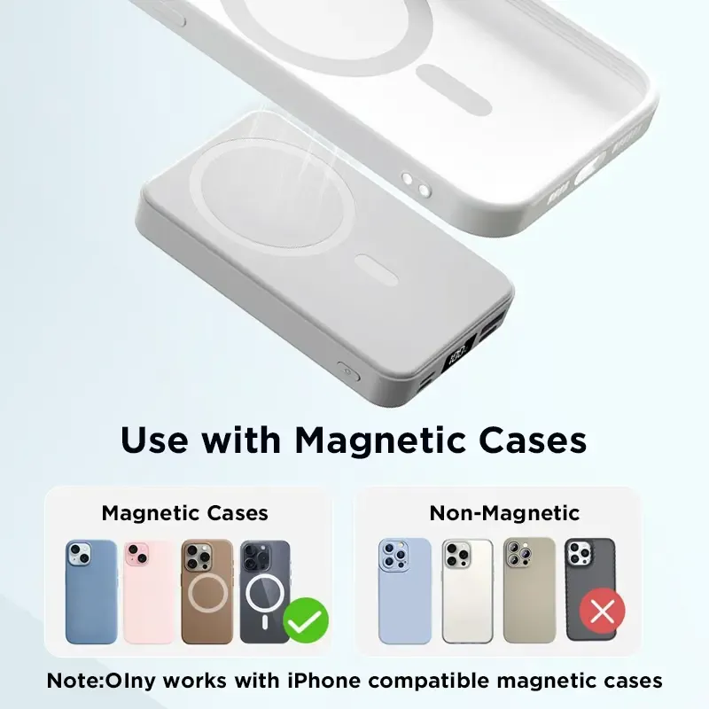 This 10000mAh Magnetic Wireless Power Bank is designed for iPhone 12–16 series. For best magnetic grip, use with a MagSafe case or without a case.