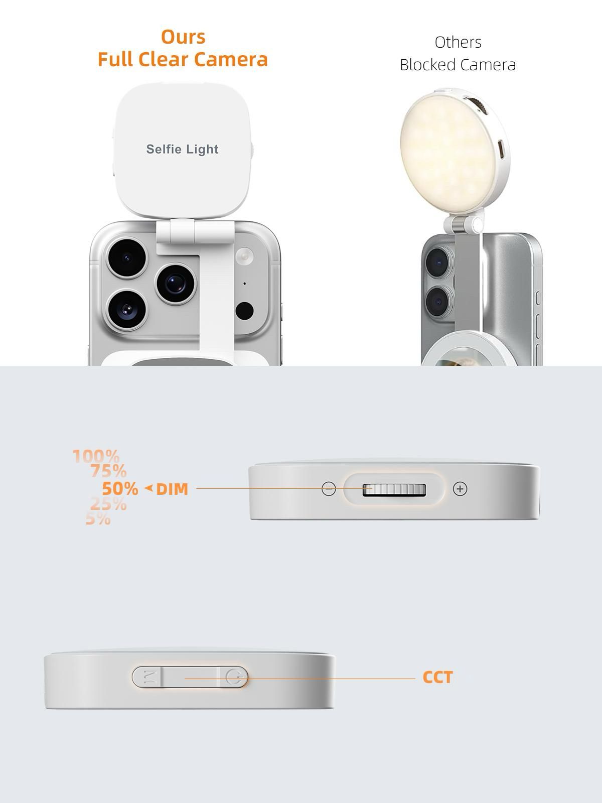 【Magnetic Selfie Light with Adjustable Angles 】 The mini fill ringlight is compatible with MagSafe, featuring strong magnetic force to attach to magnetic phones like iPhone 17 Pro Max, Plus, 16/15/14/13/12 Mini, iPad Pro, Samsung Galaxy S24, S23 Ultra. For non-magnetic devices, use the included adhesive magnetic ring accessory. It supports 360° horizontal rotation and 270° vertical tilt, allowing you to adjust the lighting angle effortlessly.